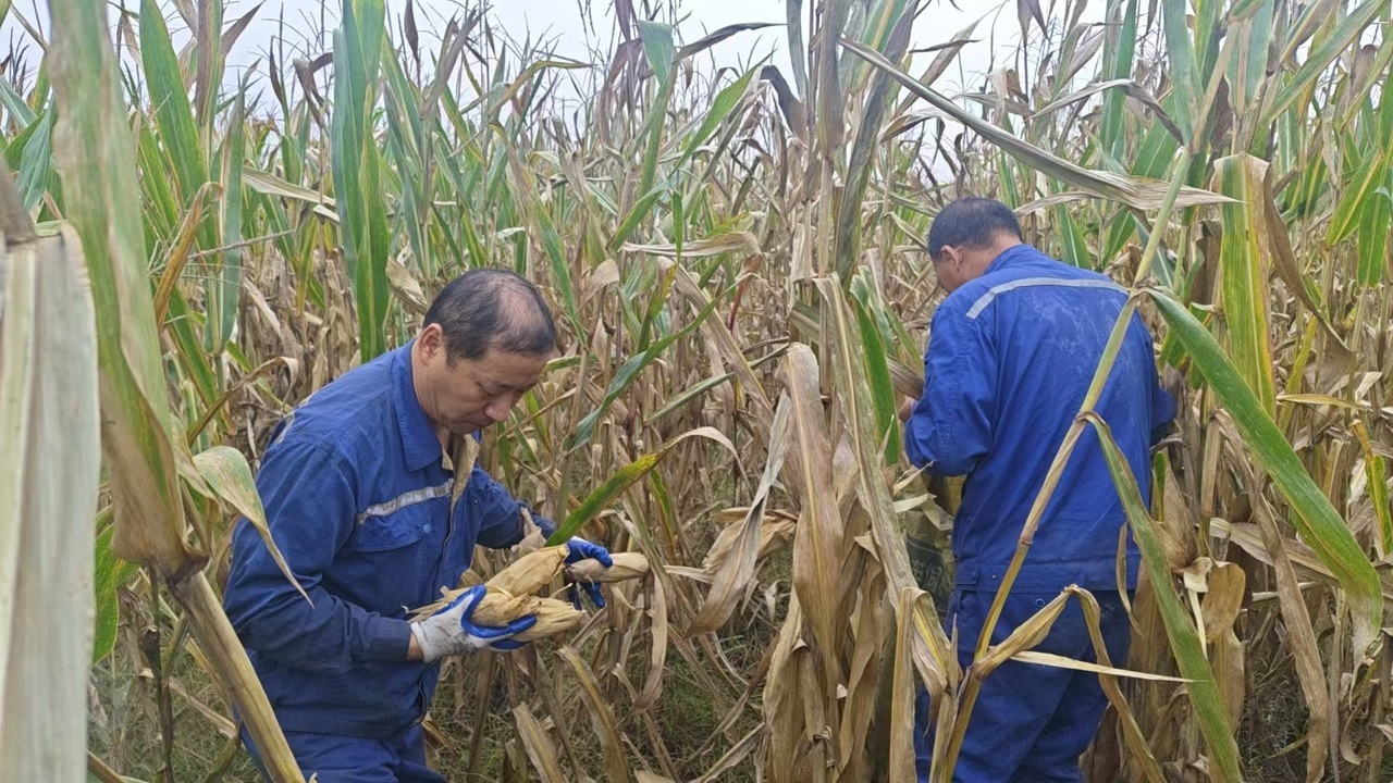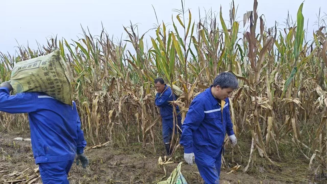 抢收现场,大家迅速分工、默契协作,有的弓腰挥镰收割玉米秆,有的快速剥去裹着泥水的玉米苞叶,有的肩扛手搬将装袋的玉米运到路边干爽处。泥泞的田埂上、翠绿的玉米行间,到处是忙碌的身影,田间地头涌动着“一家人”的暖流。经过一整天的奋战,六亩玉米全部完成抢收并转运至安全地带,彻底化解了职工的“心头忧”。
