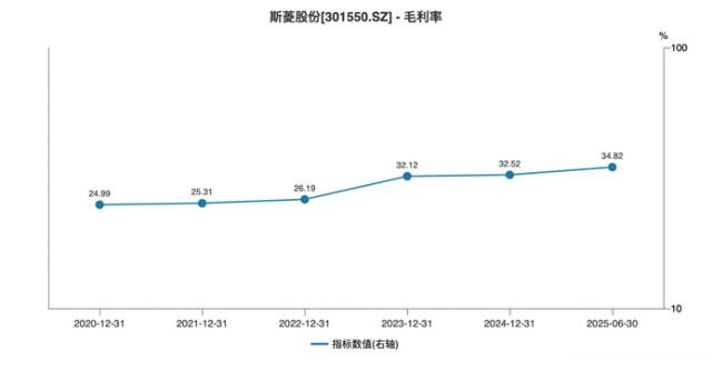 2020‑2024年,斯菱股份得益于下游需求稳步增长,营收从5.25亿元增至7.74亿元,年均复合增速10.2%;同时,由于产品结构优化叠加扎根轮毂轴承海外售后市场,实现市场拓展,公司毛利率不断提升,由2020年的24.99%连续增至2024年的32.52%。