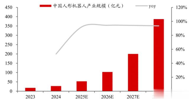 据中商产业研究院预测,至2025年,中国人形机器人市场规模将达到约53亿元,2027年预计扩大至200亿元,2025-2027CAGR为94%,产业规模保持高速增长。