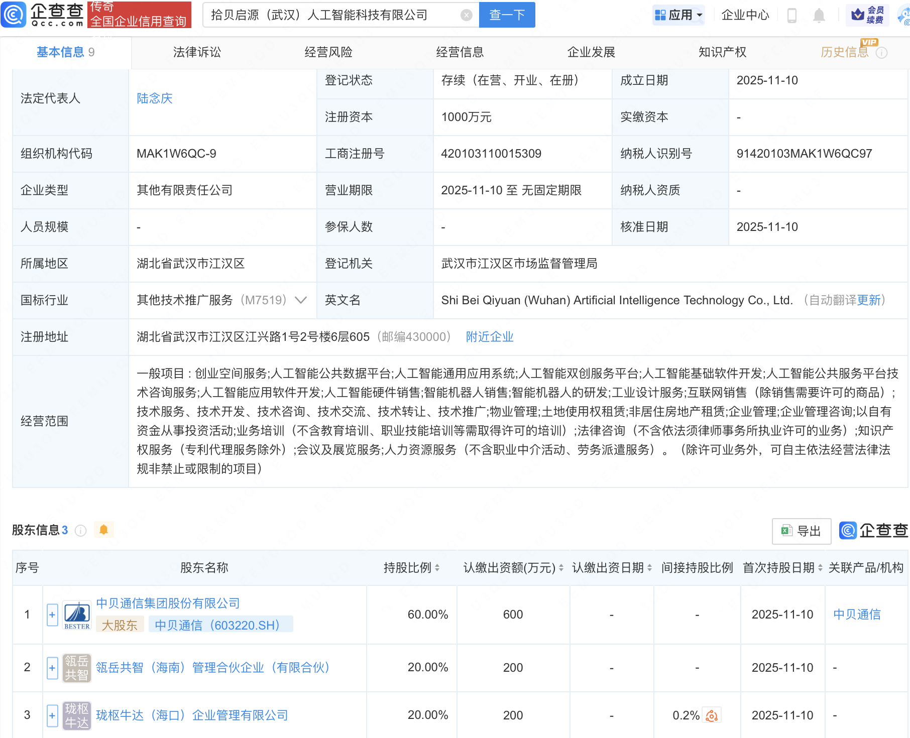 近日,拾贝启源(武汉)人工智能科技有限公司成立,注册资本1000万元,经营范围包含:人工智能公共服务平台技术咨询服务;人工智能应用软件开发;人工智能硬件销售;智能机器人销售;智能机器人的研发等。企查查股权穿透显示,该公司由中贝通信(603220)等共同持股。