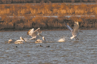 近日,温州湾新区瓯飞围区迎来了一批特殊的 “客人”——国家一级重点保护野生动物、世界珍稀濒危物种卷羽鹈鹕。这种水鸟被称为“鸟界大嘴王”,体形魁梧,偏爱在湖泊、河岸与沼泽地带集群栖息,拥有出色的飞行能力。作为东亚——澳大利西亚候鸟迁飞路线的关键驿站,近年来温州湾新区每年冬季都会有众多珍稀鸟类如约而至。